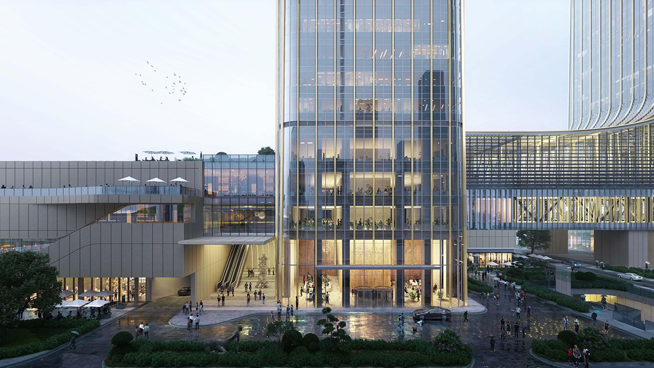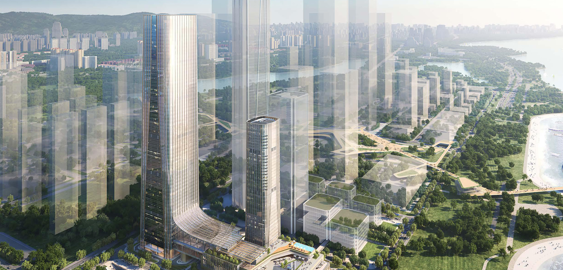 建筑高度:300米(A塔62層)、170米(B塔) 幕墻面積:12.97萬(wàn)㎡ 項(xiàng)目設(shè)計(jì):美國(guó)Gensler建筑事務(wù)所 幕墻類(lèi)型:?jiǎn)卧讲A粔?、框架式玻璃幕墻?
