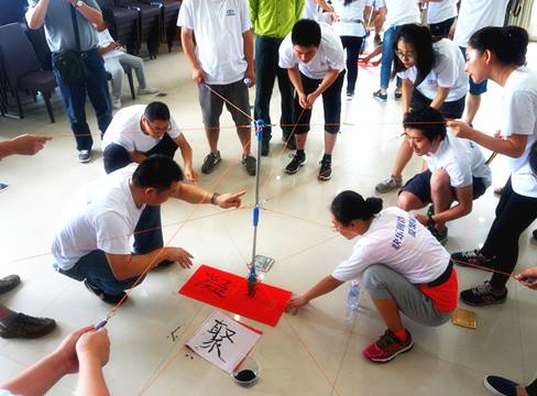 活動(dòng)需要大家協(xié)作配合共同用繩子拉住一只巨大的毛筆來(lái)完成各種風(fēng)格的書法作品。需要團(tuán)隊(duì)成員充分發(fā)揮自身優(yōu)勢(shì)在協(xié)作中主動(dòng)承擔(dān)不同的角色并積極主動(dòng)的進(jìn)行溝通,每一幅作品都是團(tuán)隊(duì)智慧與隊(duì)員個(gè)性的融合。