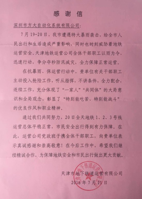 近日,天津地鐵運(yùn)營公司向方大自動(dòng)化系統(tǒng)有限公司發(fā)來感謝信,高度評價(jià)自動(dòng)化公司在天津地鐵“抗暴雨、保運(yùn)營”行動(dòng)中的優(yōu)良表現(xiàn)。感謝信說,7月19日至20日,天津市遭遇特大暴雨,地鐵運(yùn)營面臨威脅,自動(dòng)化公司員工主動(dòng)投入搶險(xiǎn)工作,聽從指揮,連續(xù)工作,彰顯了“特別能吃苦,特別能戰(zhàn)斗”的優(yōu)良作風(fēng)和職業(yè)精神,天津地鐵公司對此表示真誠感謝和崇高敬意,希望繼續(xù)精誠合作。