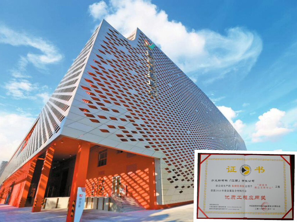 方大氟碳鋁單板應(yīng)用于深圳南山文體中心,榮獲2016年度金屬復(fù)合材料行業(yè)“優(yōu)質(zhì)工程應(yīng)用獎(jiǎng)”