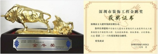 近日,由方大集團(tuán)全資子公司深圳市方大建科集團(tuán)有限公司(簡稱:方大建科)承建幕墻工程的深圳中信銀行大廈分別獲得由深圳市建筑業(yè)協(xié)會(huì)頒發(fā)的金牛獎(jiǎng)、由深圳市裝飾行業(yè)協(xié)會(huì)頒發(fā)的金鵬獎(jiǎng)兩項(xiàng)榮譽(yù)。