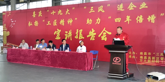 10月19日下午,由南昌市“三風(fēng)辦”主辦的“喜慶十九大,‘三風(fēng)’進(jìn)企業(yè)”·弘揚(yáng)“工匠精神”,助力“四年倍增”宣講報(bào)告會(huì)走進(jìn)方大集團(tuán)全資子公司方大新材料(江西)有限公司(簡(jiǎn)稱:江西新材,下同)。南昌市政協(xié)副主席萬(wàn)敏率政協(xié)委員一行出席活動(dòng),南昌市政協(xié)委員、江西新材董事長(zhǎng)熊建偉、江西新材總經(jīng)理黃敬、江西置地總經(jīng)理李軍陪同出席。