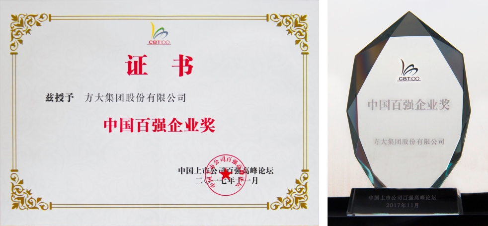 11月18日,第十七屆中國(guó)上市公司百?gòu)?qiáng)高峰論壇在北京舉行,同時(shí)公布了“2017年中國(guó)上市公司百?gòu)?qiáng)排行榜”,方大集團(tuán)股份有限公司獲頒“中國(guó)百?gòu)?qiáng)企業(yè)獎(jiǎng)”。