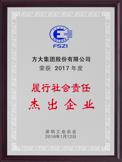 2017年度“履行社會責(zé)任杰出企業(yè)”榮譽稱號由深圳工業(yè)總會評選,授予積極履行社會責(zé)任、有極強的社會責(zé)任榮譽感的企業(yè),本屆共有包括方大集團在內(nèi)的19家企業(yè)獲得了該項榮譽稱號。