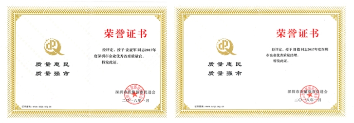 2017年度“深圳市企業(yè)優(yōu)秀首席質(zhì)量官”、2017年度“深圳市企業(yè)優(yōu)秀質(zhì)量經(jīng)理”榮譽(yù)稱號(hào)由深圳市質(zhì)量強(qiáng)市促進(jìn)會(huì)組織評(píng)選,旨在培養(yǎng)支撐企業(yè)首席質(zhì)量官制度落實(shí)的關(guān)建人才隊(duì)伍,弘揚(yáng)企業(yè)質(zhì)量文化,引領(lǐng)和推動(dòng)所在行業(yè)質(zhì)量進(jìn)步。