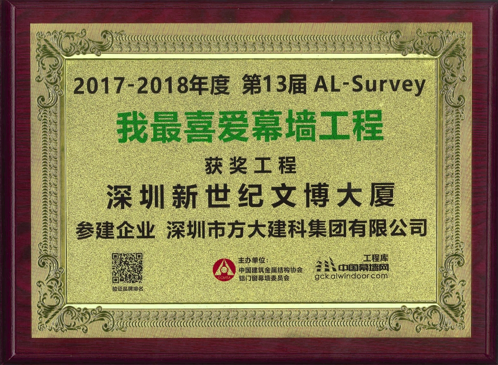 第13屆“我最喜愛幕墻工程”評(píng)選活動(dòng)由中國(guó)建筑金屬結(jié)構(gòu)協(xié)會(huì)鋁門窗幕墻委員會(huì)、中國(guó)幕墻網(wǎng)聯(lián)合發(fā)起,經(jīng)廣大網(wǎng)友投票及專家評(píng)審,方大建科承建幕墻工程的深圳新世紀(jì)文博大廈最終以216740的高票和專家五星評(píng)價(jià)獲獎(jiǎng)。