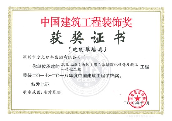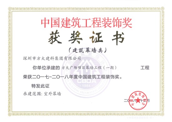 中國建筑工程裝飾獎是由中國建筑裝飾協(xié)會主辦的評選活動,自2001年起每年進行評選,是建設(shè)部批準設(shè)立的中國建筑裝飾行業(yè)的最高榮譽獎。方大建科承建的四項幕墻工程獲此獎項,是對公司精湛的幕墻設(shè)計能力和先進的施工工藝的充分肯定。