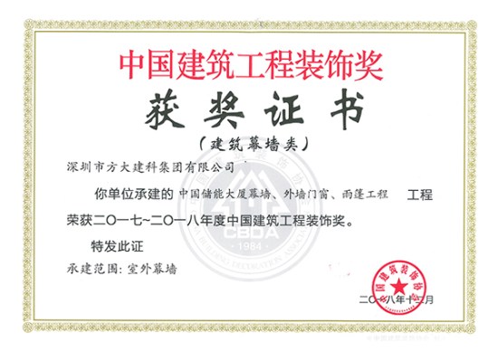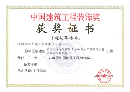 近日,中國建筑裝飾協(xié)會頒發(fā)了2017-2018年度中國建筑工程裝飾獎的獲獎證書,方大集團股份有限公司全資子公司深圳市方大建科集團有限公司承建的四項幕墻工程榮獲中國建筑工程裝飾獎——方大廣場(一期)、深業(yè)上城(南區(qū))塔2、中國儲能大廈、中國南方電網(wǎng)有限責(zé)任公司生產(chǎn)科研綜合基地。