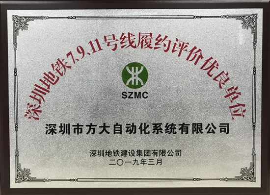 近日,深圳地鐵建設集團有限公司授予方大集團全資子公司方大智創(chuàng)科技有限公司(原深圳市方大自動化系統(tǒng)有限公司)“履約評價優(yōu)良單位”獎。