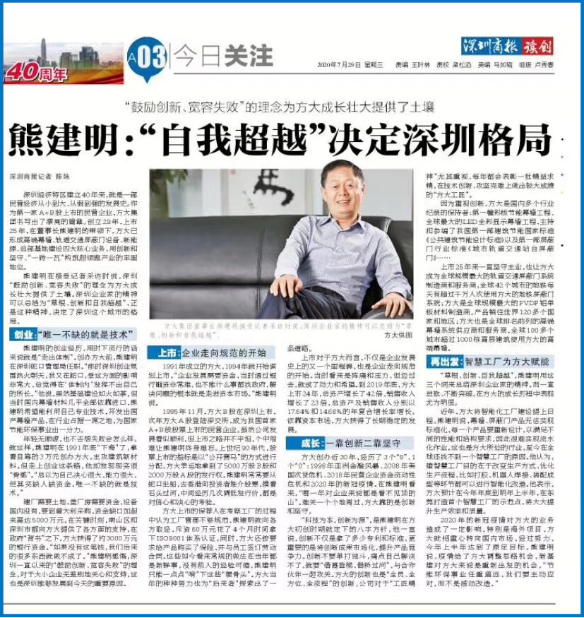深圳經(jīng)濟特區(qū)建立40年來,就是一部民營經(jīng)濟從小到大、從弱到強的發(fā)展史。作為首批A+B股上市的民營企業(yè),方大集團書寫出了漂亮的篇章。創(chuàng)立29年、上市25年,在董事長熊建明的帶領(lǐng)下,方大已形成高端幕墻、軌道交通屏蔽門設(shè)備、新能源、總部基地建設(shè)四大核心業(yè)務(wù),用創(chuàng)新和堅守、“一磚一瓦”構(gòu)筑起領(lǐng)跑產(chǎn)業(yè)的牢固地位。