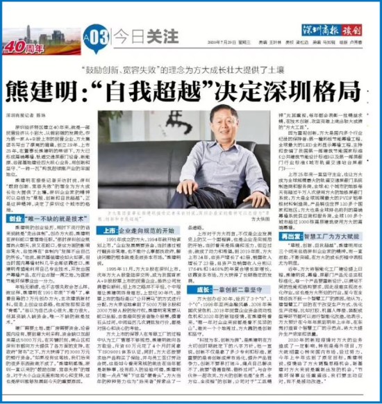 “草根、創(chuàng)新、自我超越”,熊建明用這三個詞來總結(jié)深圳企業(yè)家的精神。而一直進取、不斷突破,在方大的成長歷程中表現(xiàn)尤為明顯。